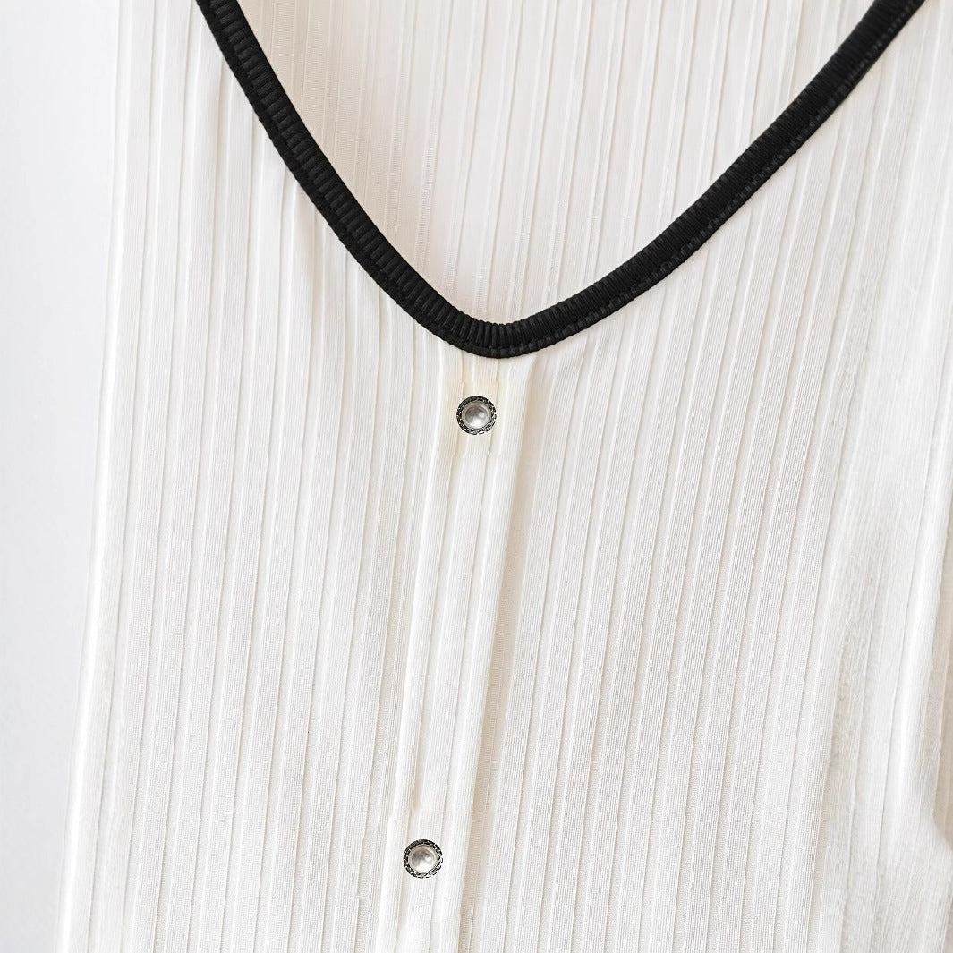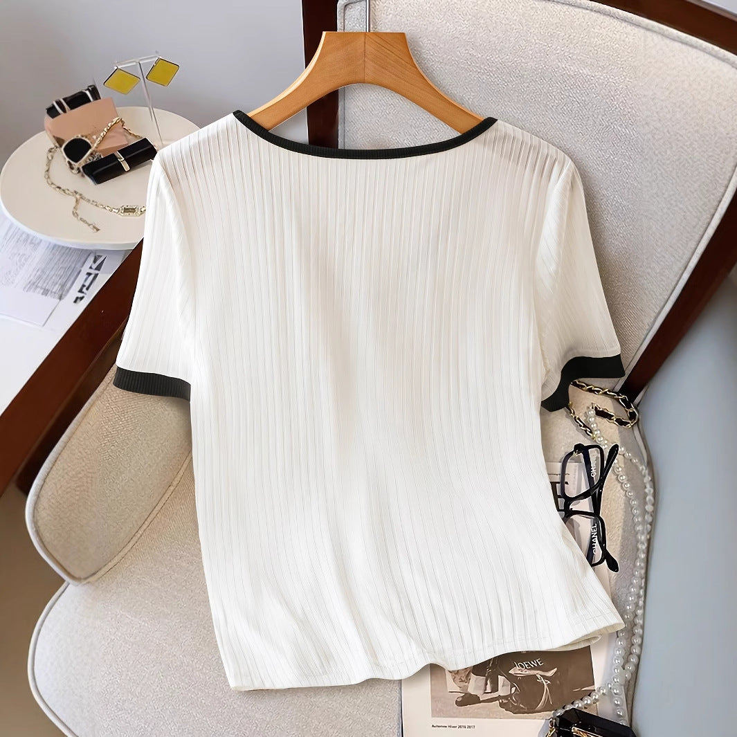 Women's Casual V-neck Short Sleeve Button Design Color Contrast T-shirt Top